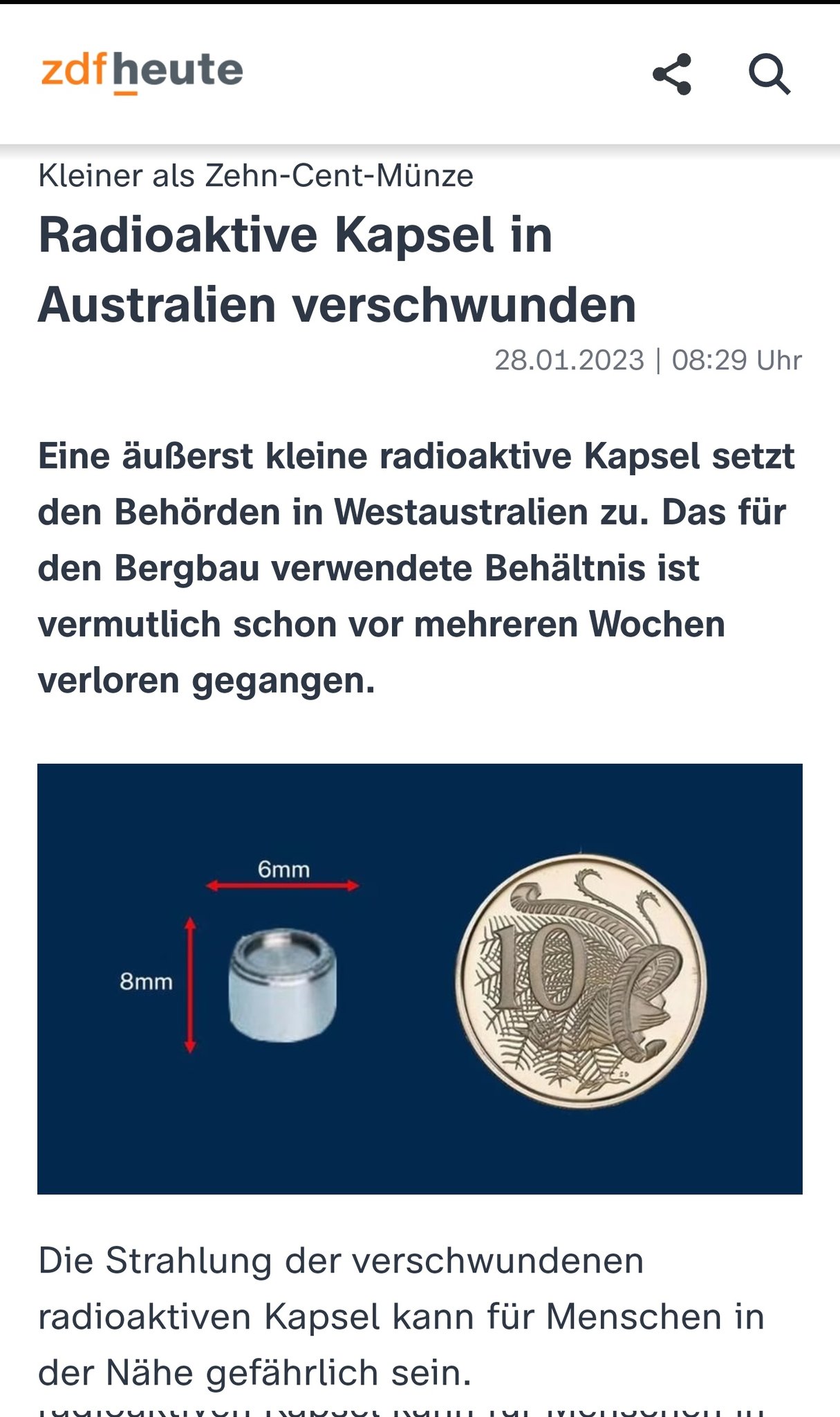 Web Die winzige gefährliche Kapsel war beim Transport von einer Mine zu einem Depot nahe der Metropole Perth offenbar von einem Lastwagen gefallen. Januar suchen die Behörden in Westaustralien eine winzige radioaktive Kapsel - auf 1400 Kilometern Strecke. Web 2 hours agoRadioactive capsule site cleared of contamination.